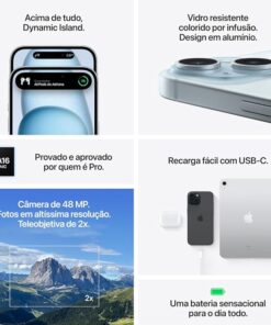 DESIGN INOVADOR — O iPhone 15 possui vidro resistente colorido por infusão e design em alumínio. Resistente a respingos, água e poeira, a parte frontal em Ceramic Shield é mais durável que qualquer vidro de smartphone. A tela Super Retina XDR de 6,1 pol. é até duas vezes mais visível sob o sol em comparação com o iPhone 14.